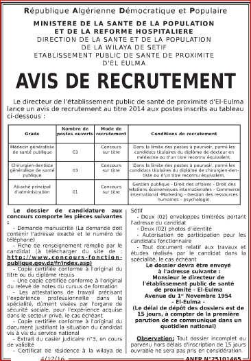 إعلان للتوظيف بالمؤسسة العمومية للصحة الجوارية العلمة سطيف بتاريخ 04-12-2016