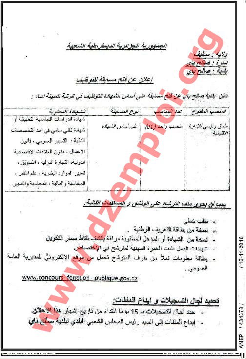 اعلان توظيف ببلدية ذراع قبيلة بسطيف 28/11/2016