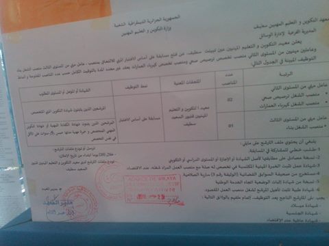 إعلان للتوظيف معهد التكوين والتعليم المهنيين سطيف بتاريخ 04-12-2016
