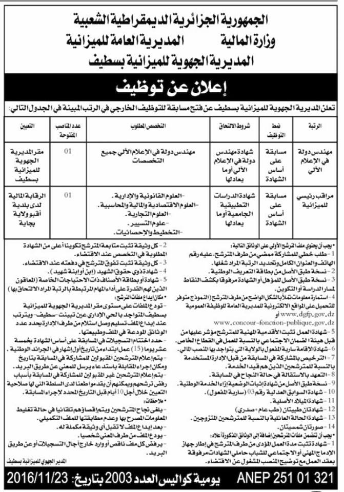 إعلان للتوظيف المديرية الجهوية للميزانية - سطيف.بتاريخ 04-12-2016