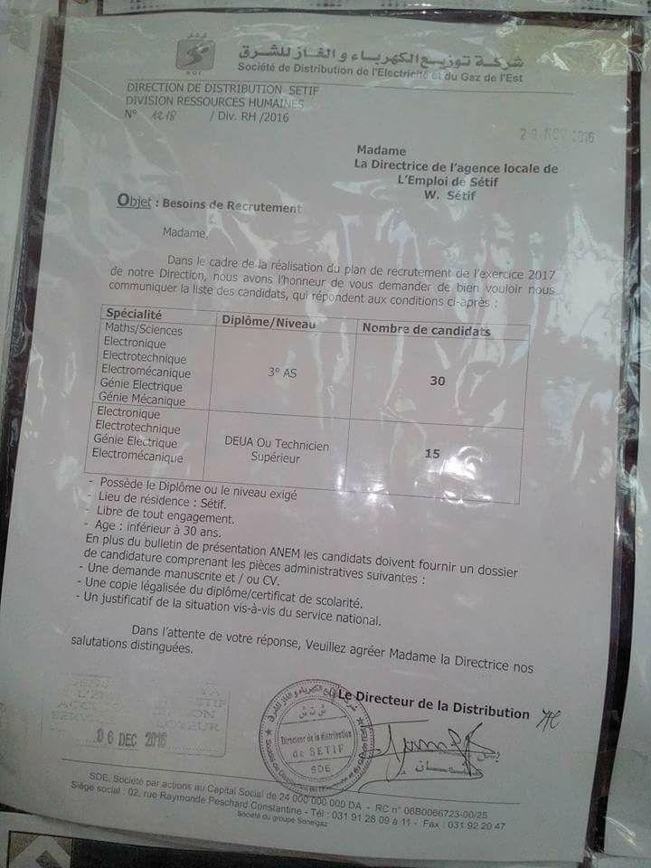 اعلان مسابقة توظيف بشركة توزيع الكهرباء والغاز بسطيف بتاريخ 06/12/2016
