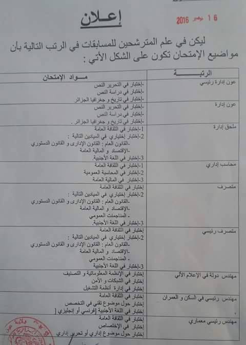 ليكن في علم المترشحين للمسابقات التالية بان مواضيع الامتحان تكون على الشكل التالي